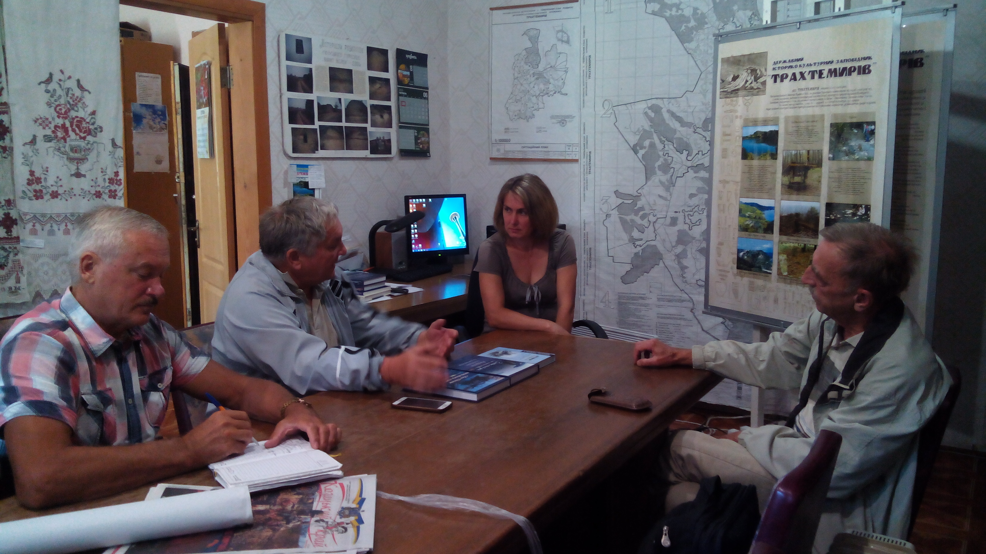 Члени ГО «Старий Дніпро» у м. Каневі обговорюють із завідувачкою науковим відділом ДІКЗ «Трахтемирів» Іриною Воропай структуру книги про Трахтемирів і Монастирок. 6 серпня 2019 р.