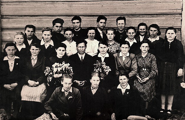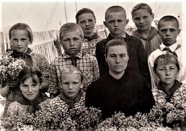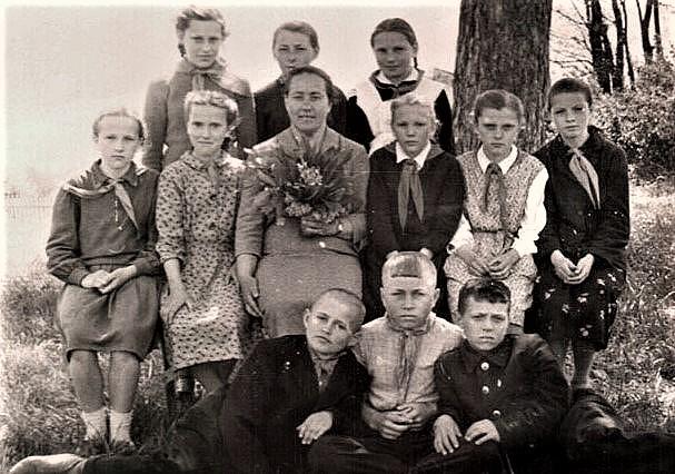 З Настею Романівною. Внизу Толя Свитко і два Колі Кравченки.