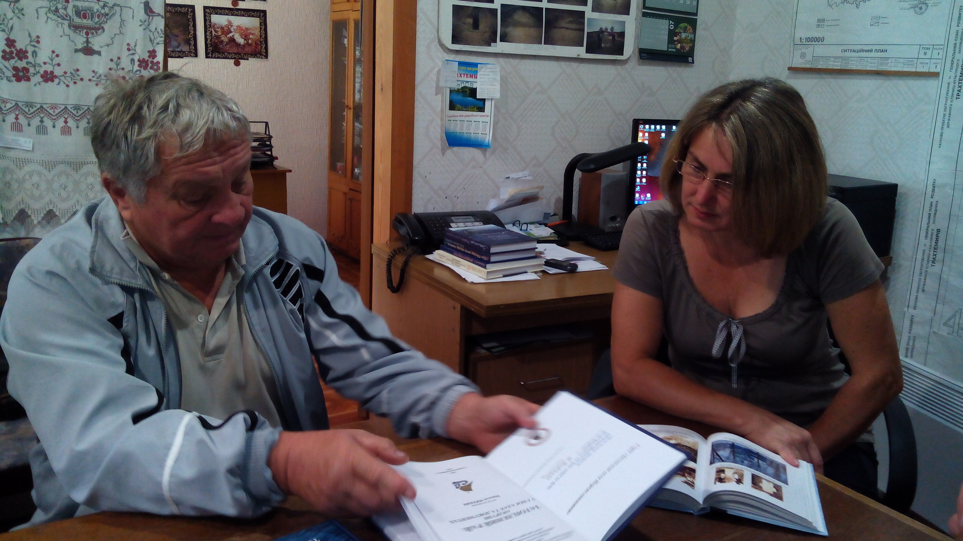 Переяславців гостинно зустріла в. о. директора Ірина Воропай, яка коротко ознайомила з результатами останніх досліджень на території ДІКЗ, а голова ГО «Старий Дніпро» Віталій Іващенко та його заступник Олександр Сулима у свою чергу розповіли їй про роботу організації, її здобутки і плани. Микола Михняк, як автор майбутньої книги, доповів на якій стадії знаходиться робота над нею, висловив своє бачення участі заповідника у написанні цього дослідження. Ірина Валеріївна також внесла свої пропозиції, більше того, познайомила з деякими раритетними книгами кінця XIX ст. для їх використання у новому науково-популярному виданні про історію Трахтемирівського півострова та людей, що його населяли.